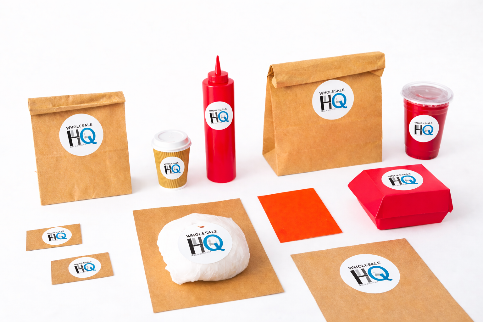 Wholesale HQ supplies custom stickers and food packaging labels designed to support branded takeaway packaging, delivery presentation, and product labelling.