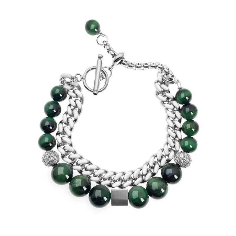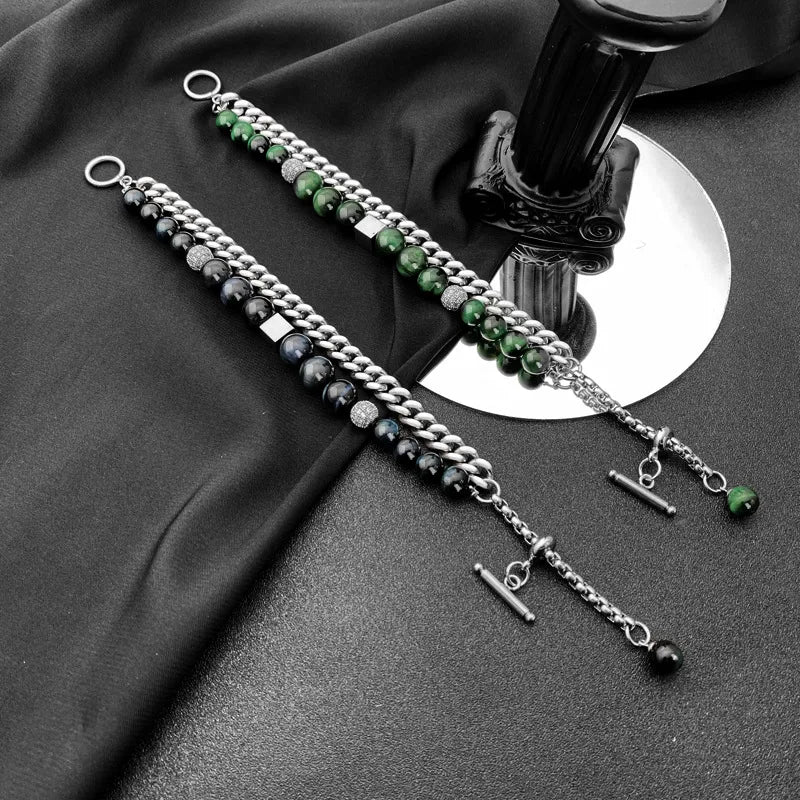 Adjustable Length Double Layered Cuban Chain Bracelet For Men And Women Tiger Eye Stone Black Obsidian Hip Hop Style Polished