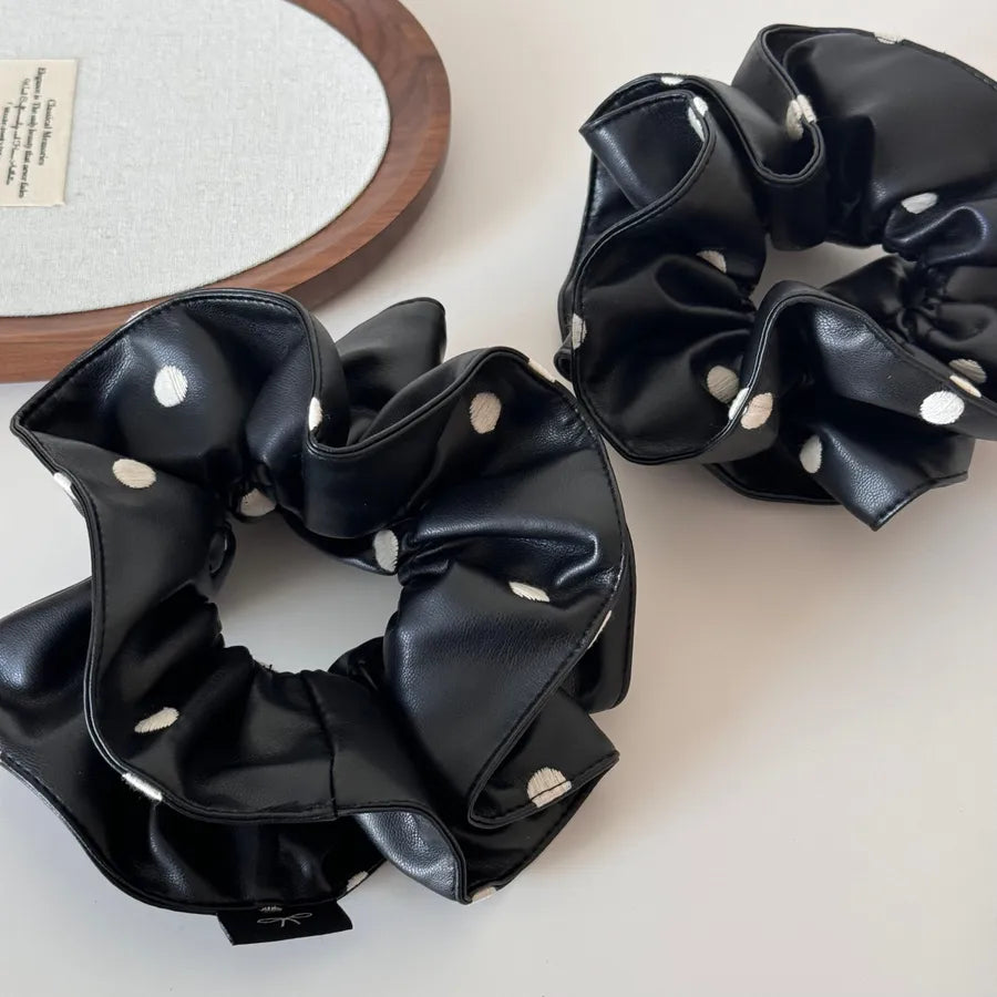 Black PU Leather Embroidered Polka Dot Hair Ties Personality Sweet Cool Style Hair Bands For Women Mixed Material Hair Accessories