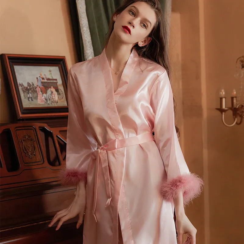 Bride Morning Robe Women's Feather Sleep Robe Wedding Makeup Bridesmaid Kimono Style Satin Bathrobe Casual Cool Home Wear