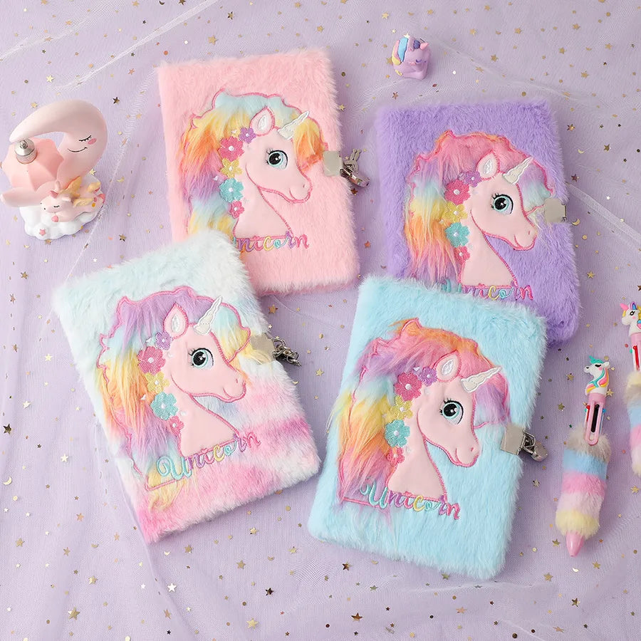 Cute A5 Cartoon Plush Notebook With Lock Children's Diary Book Girl's Scrapbooking Notebook Pink Purple Tie Dye