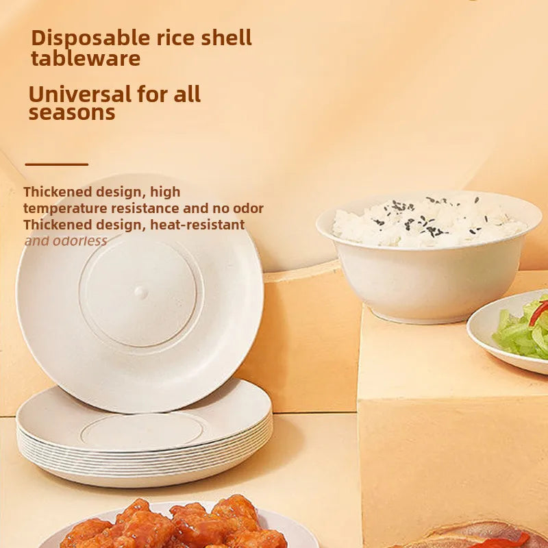 Disposable rice husk tableware plastic packaging four-piece biodegradable environmental protection tableware banquet camping barbecue disposable tableware