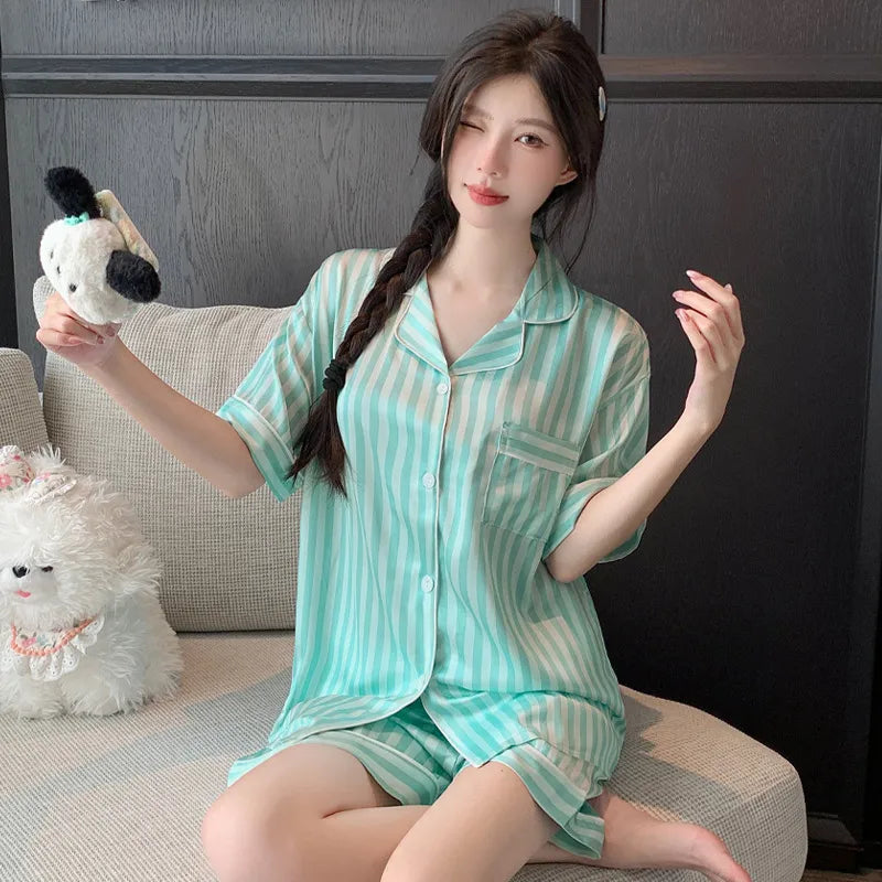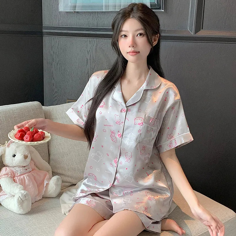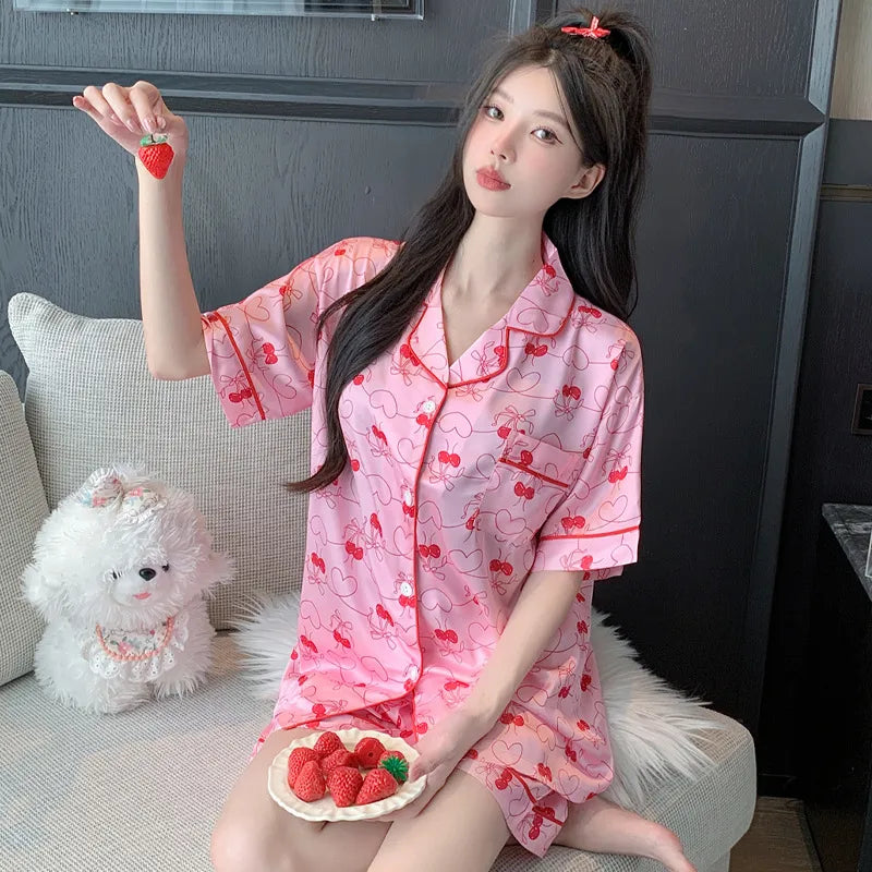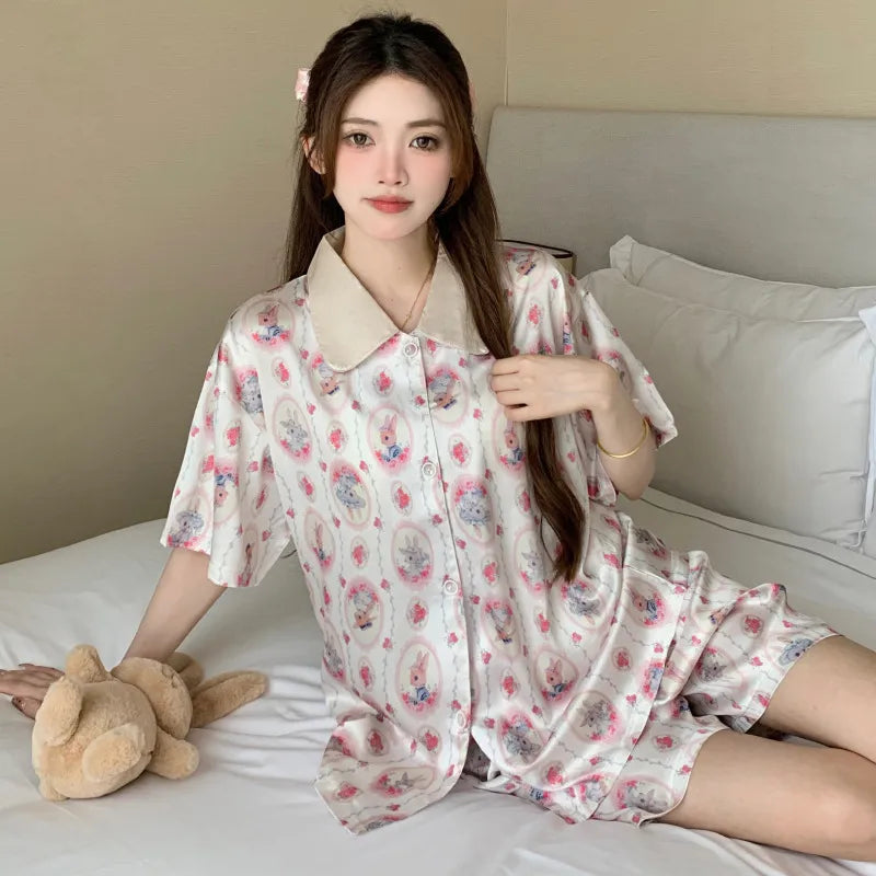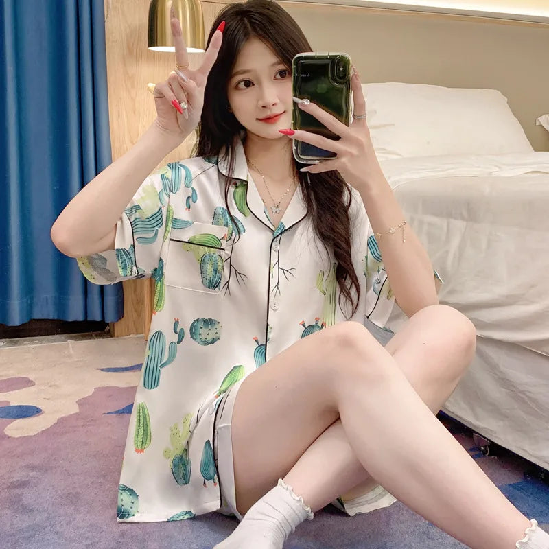 Elegant Ice Silk Sleepwear Women's Summer Butterfly Print Short Sleeve Home Clothes Set Can Be Worn Outside Breathable Casual