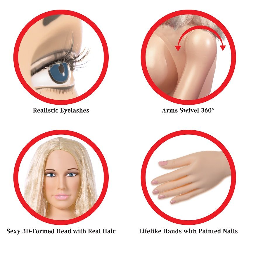 This incredible inflatable life-size doll was meticulously designed with realistic features for a truly realistic experience. Her attractive 3-D molded face is finished off with a luxurious head of hair that is eager to be pulled back. With her perky breasts you can enjoy her super soft and real nipples. Her vagina and ass tight and very realistic
