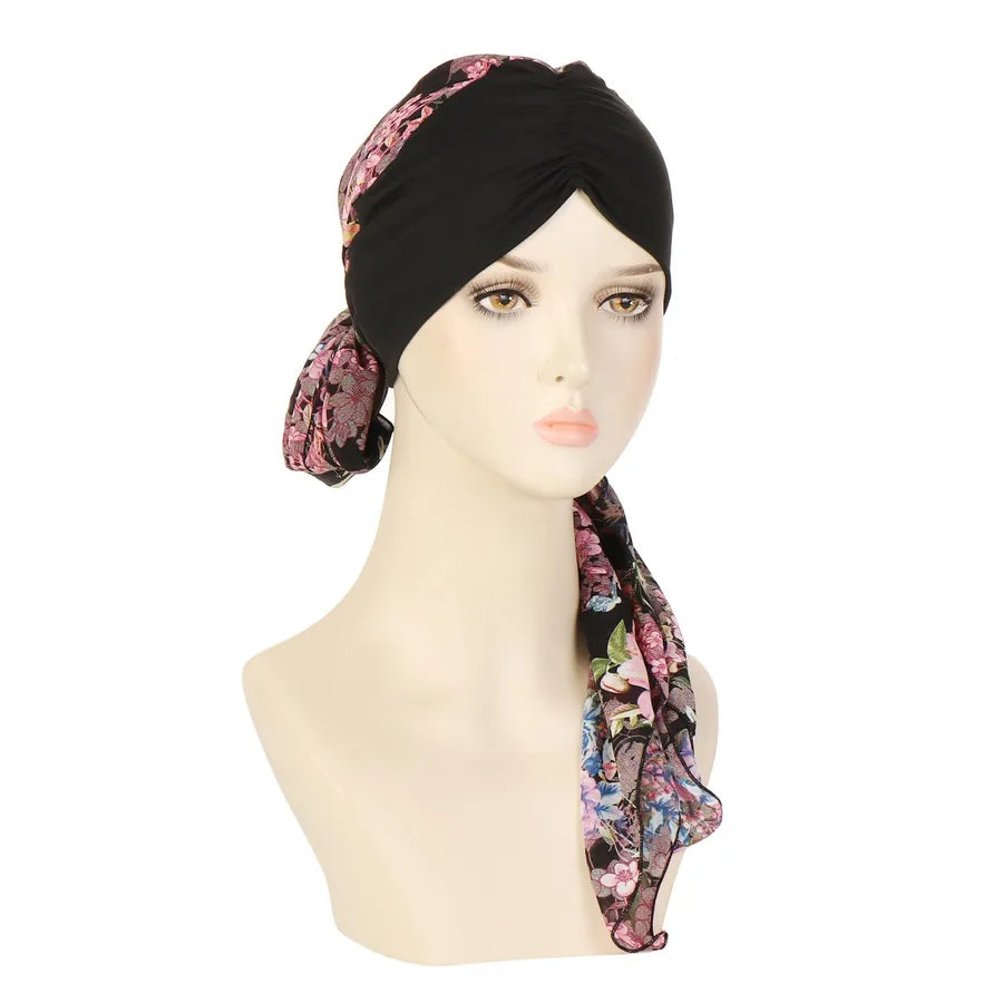 Fashionable Floral Print Chiffon Long Tail Headscarf Hat Women's Head Wrap Cap Winter Summer Spring Seasonal All-Match Hat