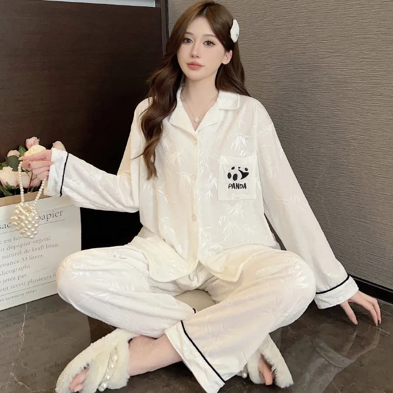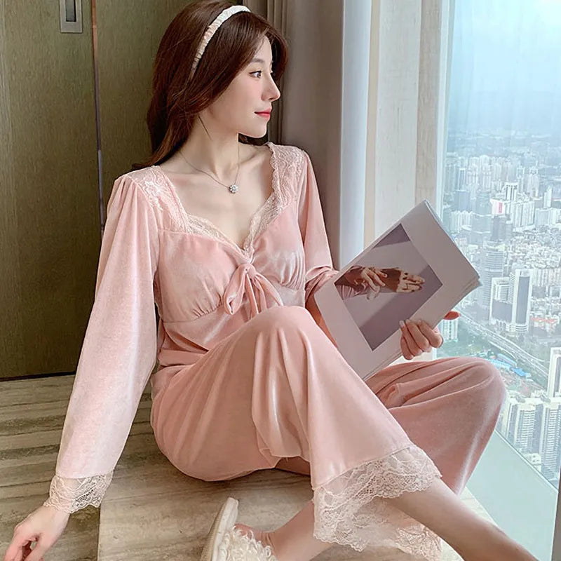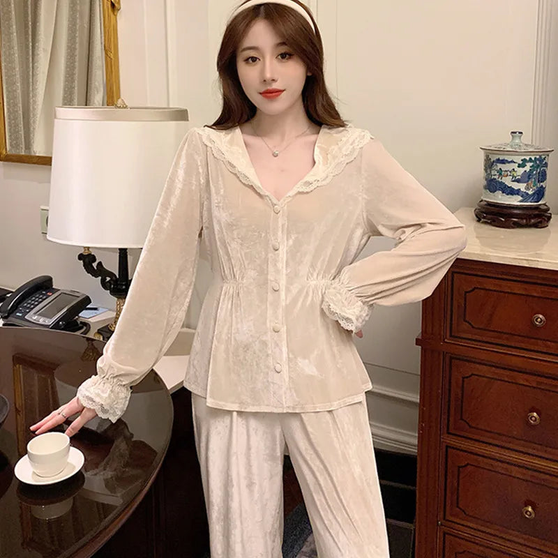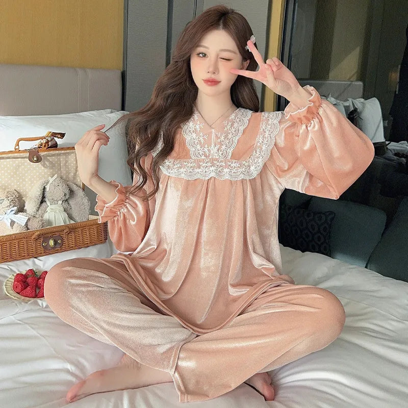 French Vintage Court Style Long Sleeve Gold Velvet Women's Home Clothes Set Autumn Winter Breathable Casual Sleepwear