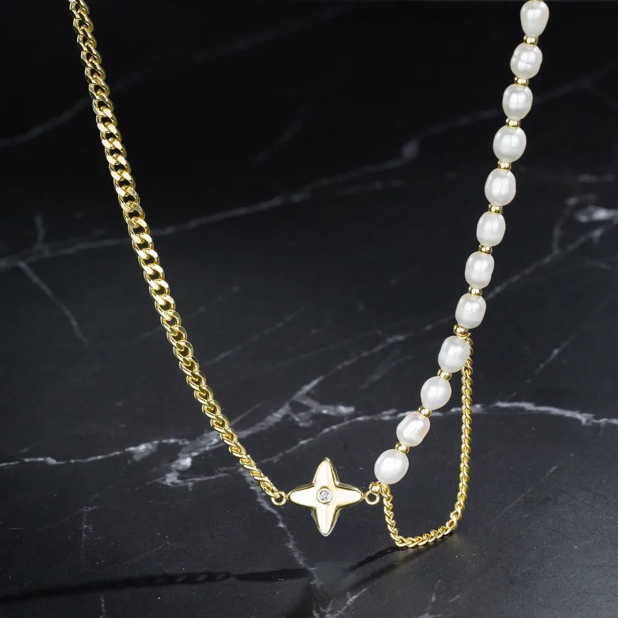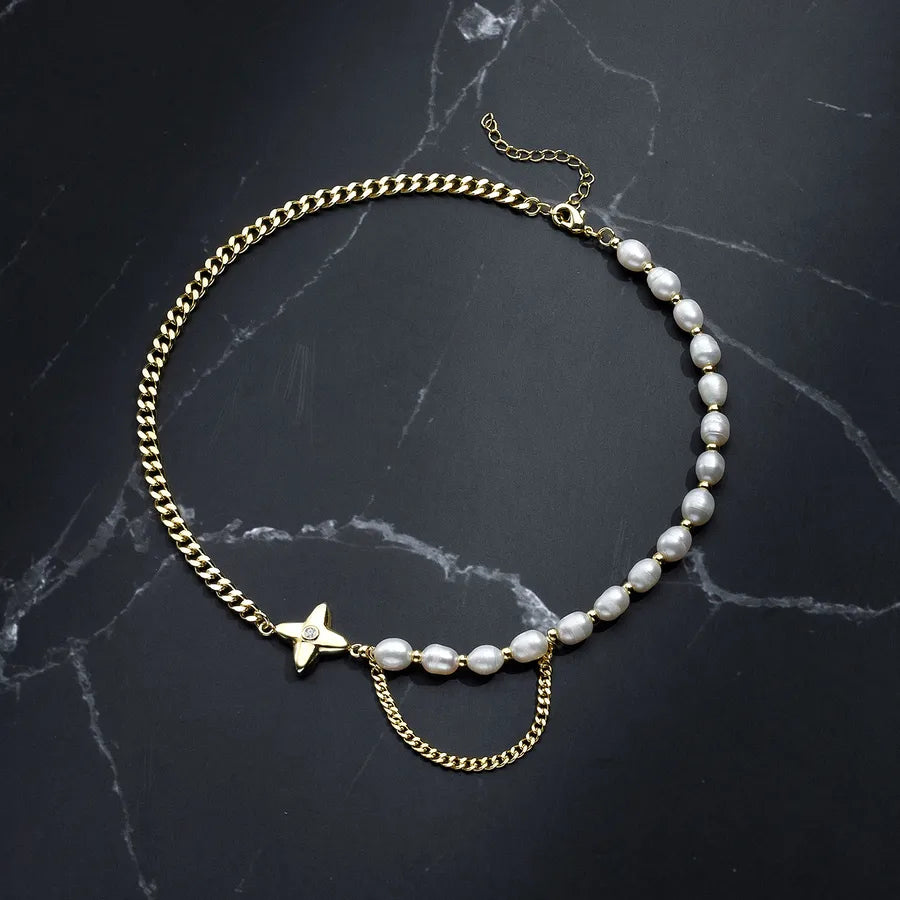Freshwater Pearl Copper Long-Lasting Plated Freshwater Pearl Cuban Link Chain Curb Chain Asymmetrical Plating Geometric Star Pendant Necklace