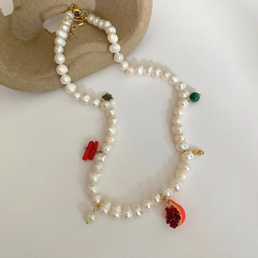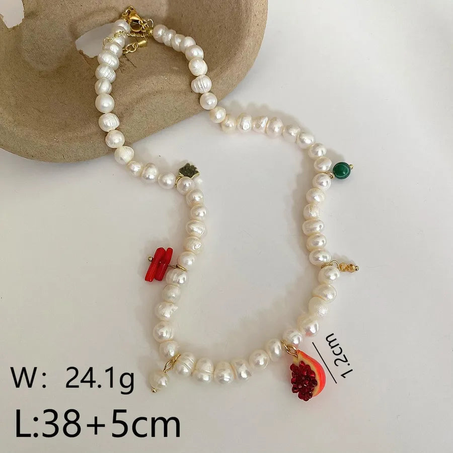 Freshwater Pearl Copper Plated Freshwater Pearl Bluestone Copper Beaded Chain Fruit Pomegranate Multi Charms Necklace
