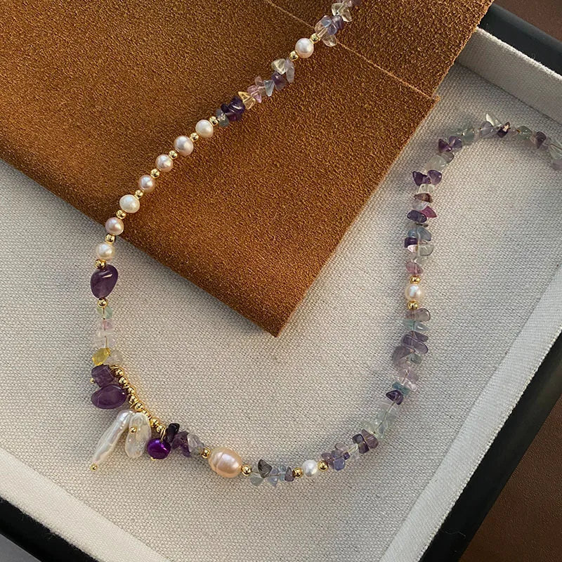Freshwater Pearl gravel Titanium Steel Beaded Chain Geometric Necklace