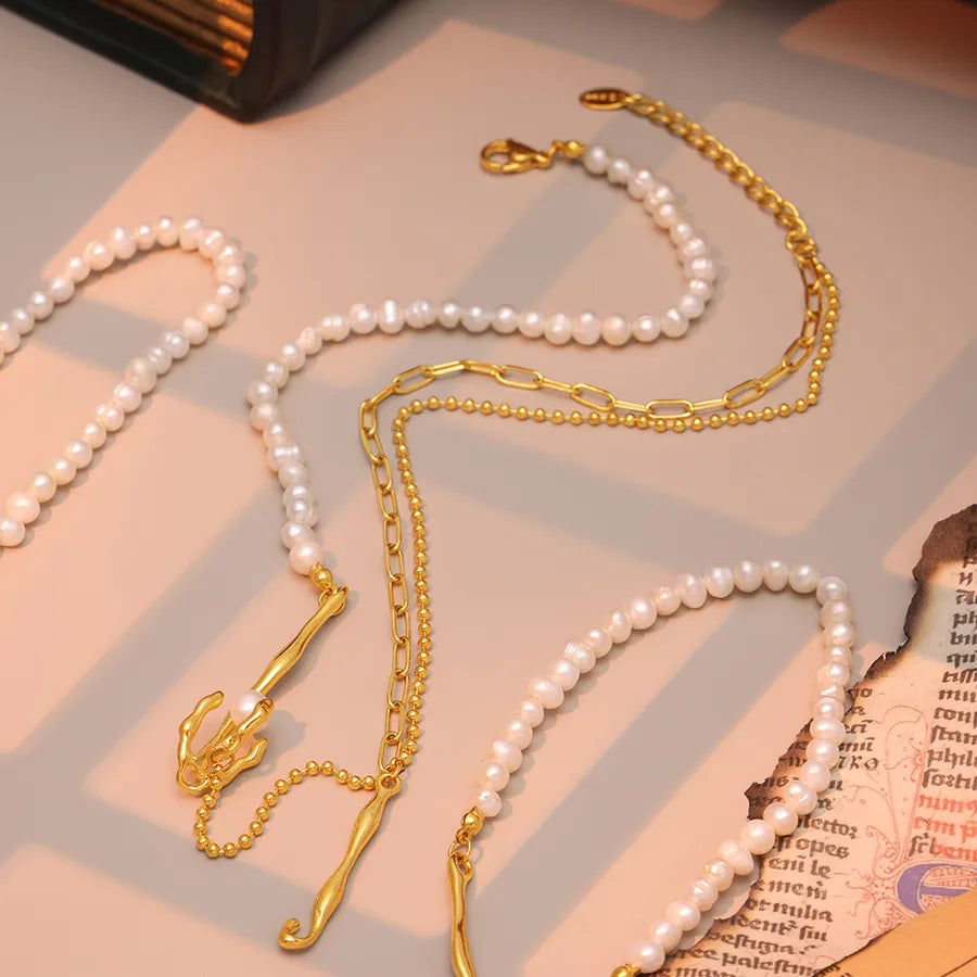 Freshwater Pearl Titanium Steel Ion Plating (IP) Beaded Chain ball chain Geometric Necklace