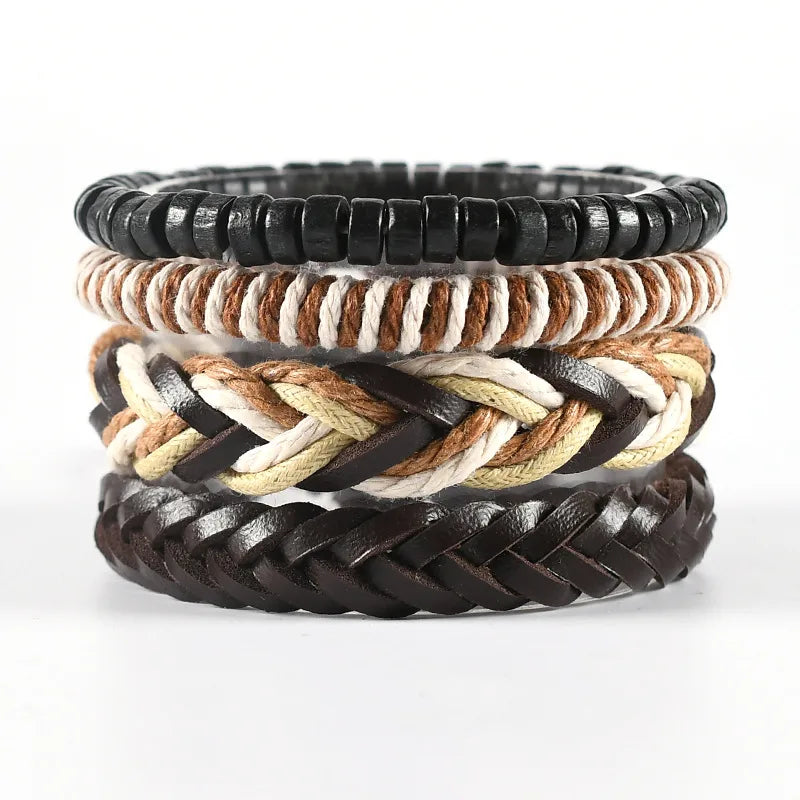 Hip-Hop Retro Geometric Pu Leather Alloy Wooden beads Braid Men's Bracelets Drawstring Bracelets