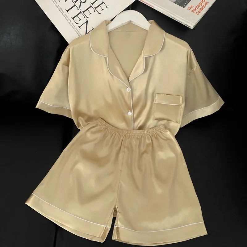 Home Women's Casual Solid Color Satin Shorts Sets Pajama Sets
