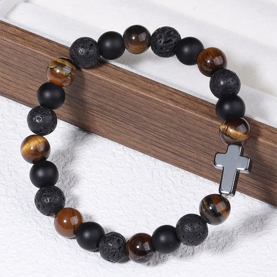 Hot Cross Beaded Bracelet Tiger Eye Volcanic Stone Natural Stone Beaded Bracelet Men's Vintage Jewelry