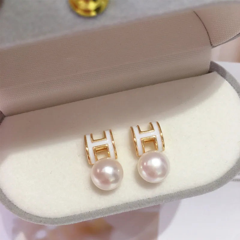 Natural Freshwater Pearl Earrings Women's 18K Bag Gold Light Luxury High Style Letter H Pearl Earrings Earrings Wholesale Zhuji