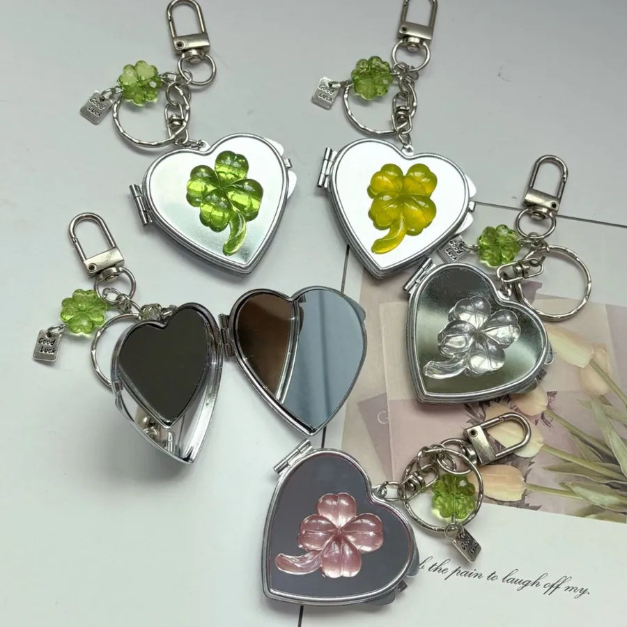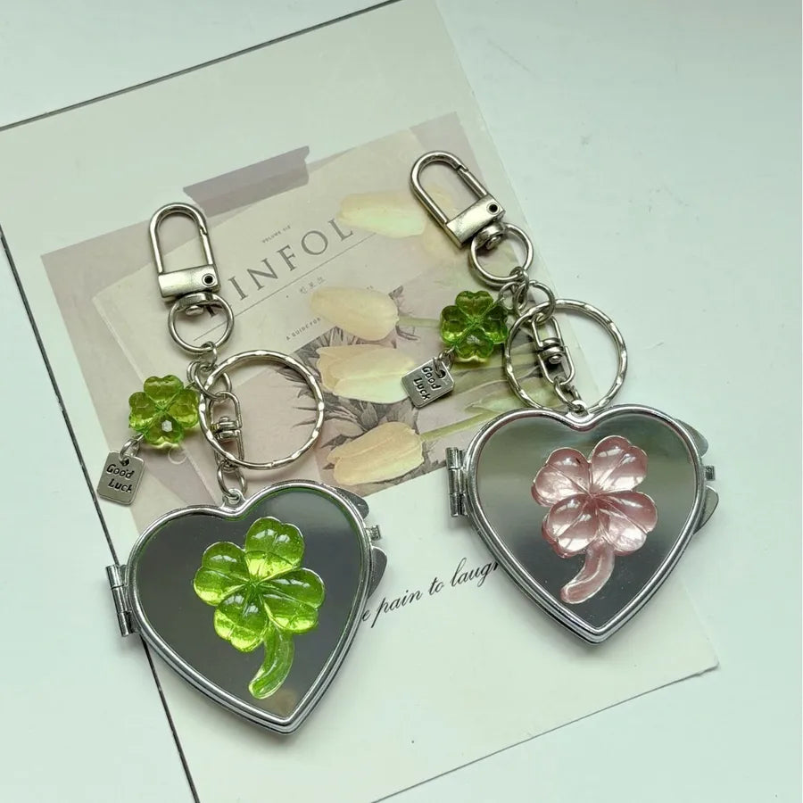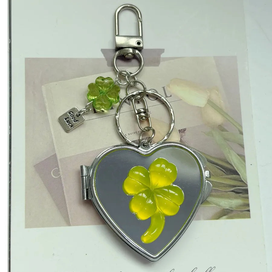 New Ins Lucky Four-Leaf Clover Heart Mirror Keychain Y2K Niche Bag Pendant High-End Accessories Make-Up