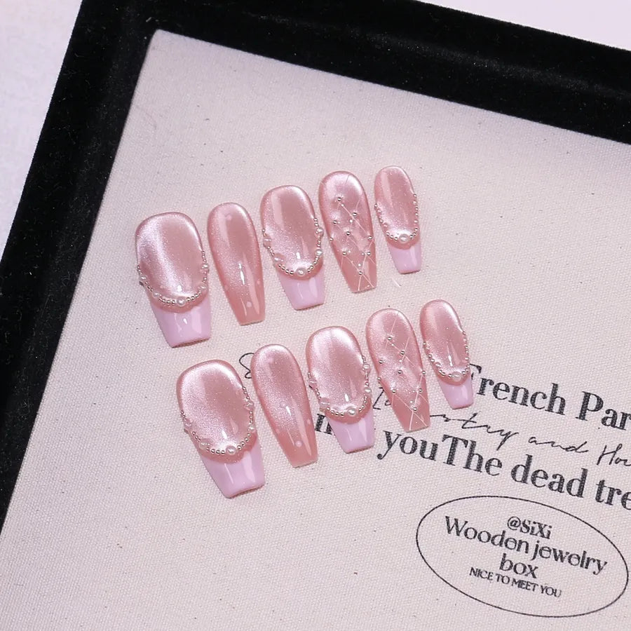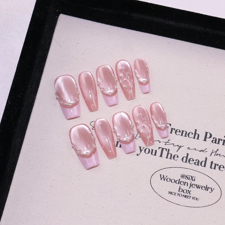New Long French Pearl Diamond Cat Eye Handmade Wearable Nail Art Detachable Premium Nail Stickers Ice Transparent Grid Pattern