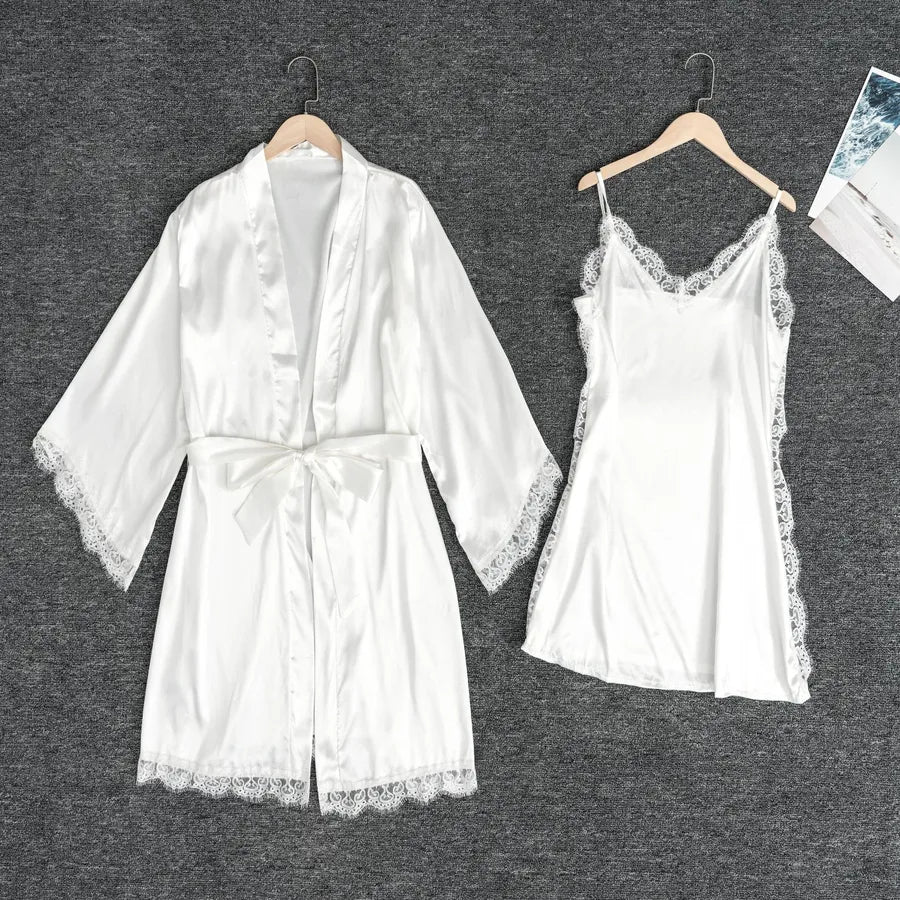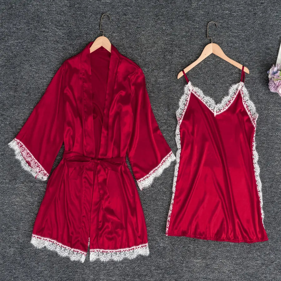 New Satin Elastic Color Block European Style Women's Sleepwear Cardigan Belted Robe Pants Pure Color Home Large Size
