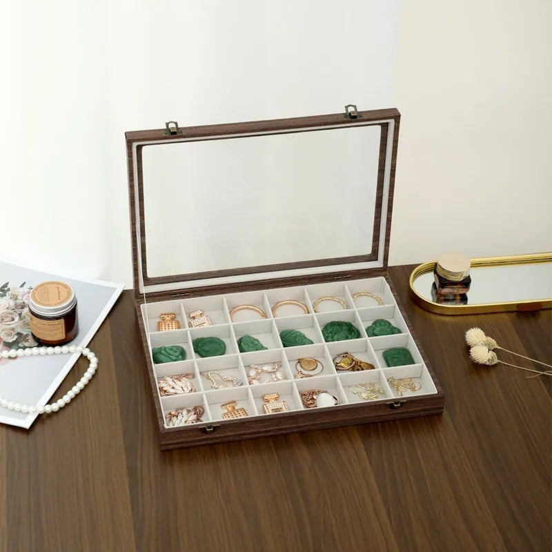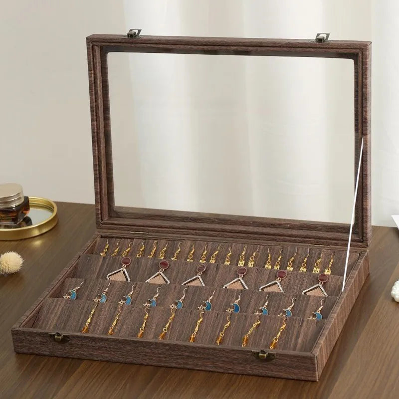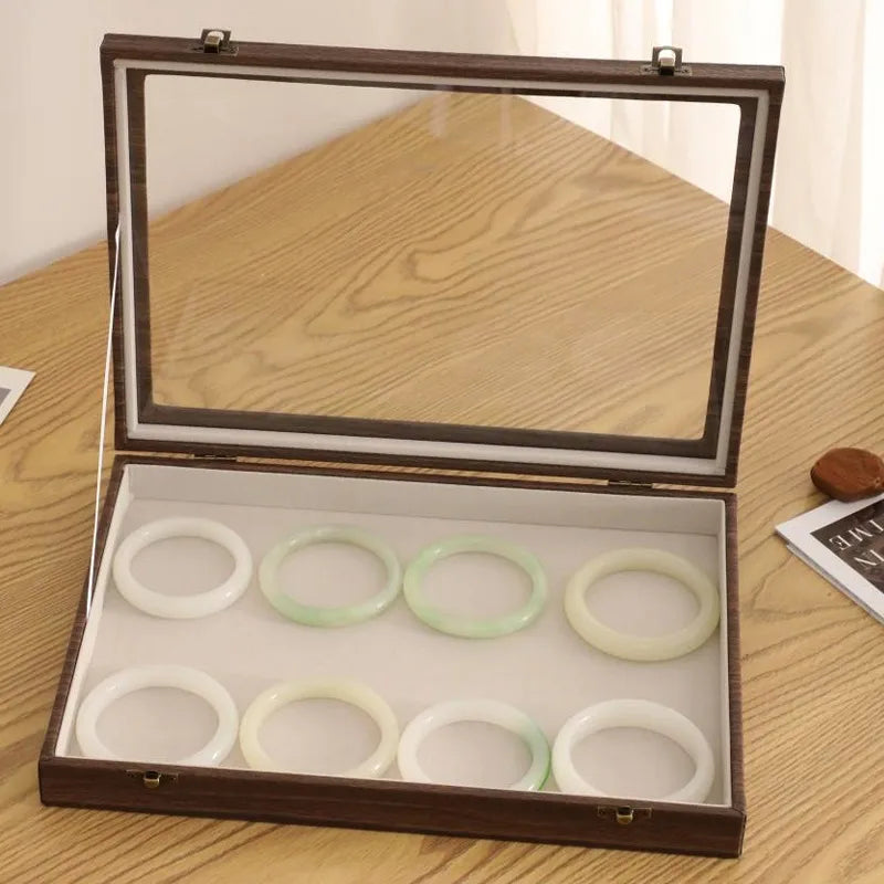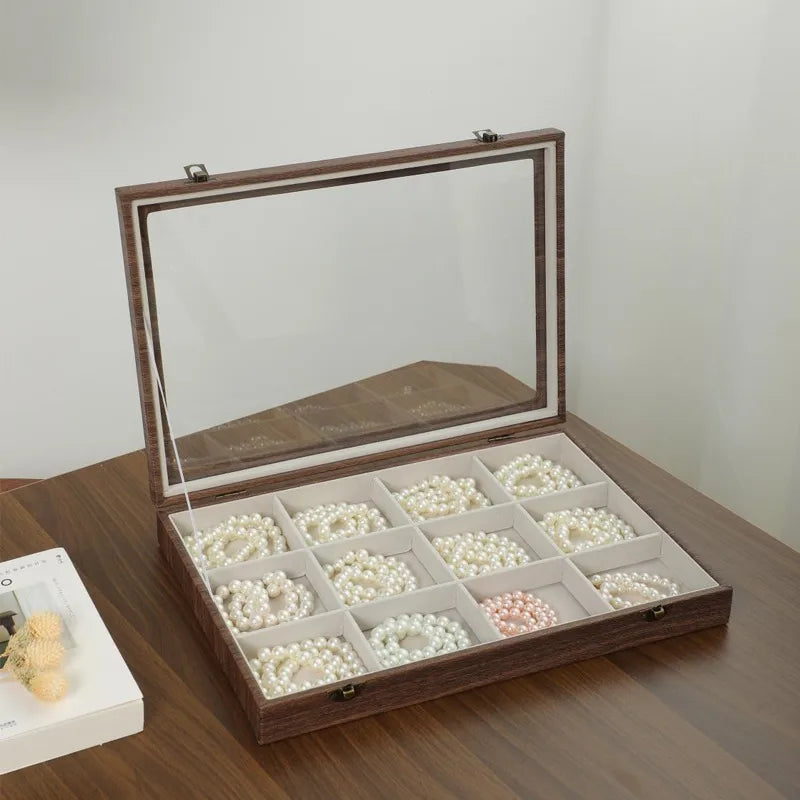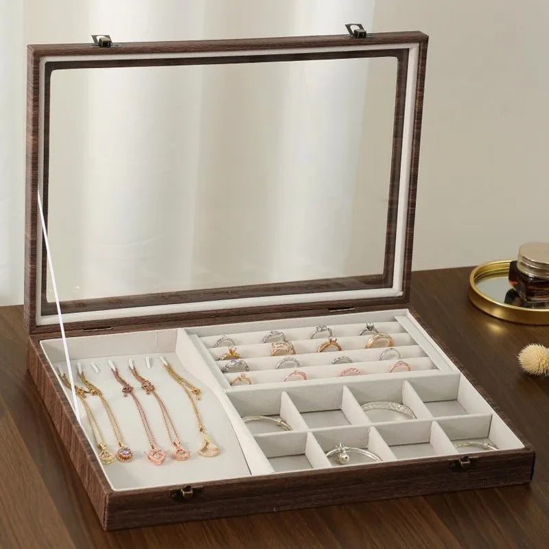 Retro Style Wooden Texture Leather Jewelry Box With Glass Lid Dustproof Storage For Rings Necklaces Bracelets Accessories Display
