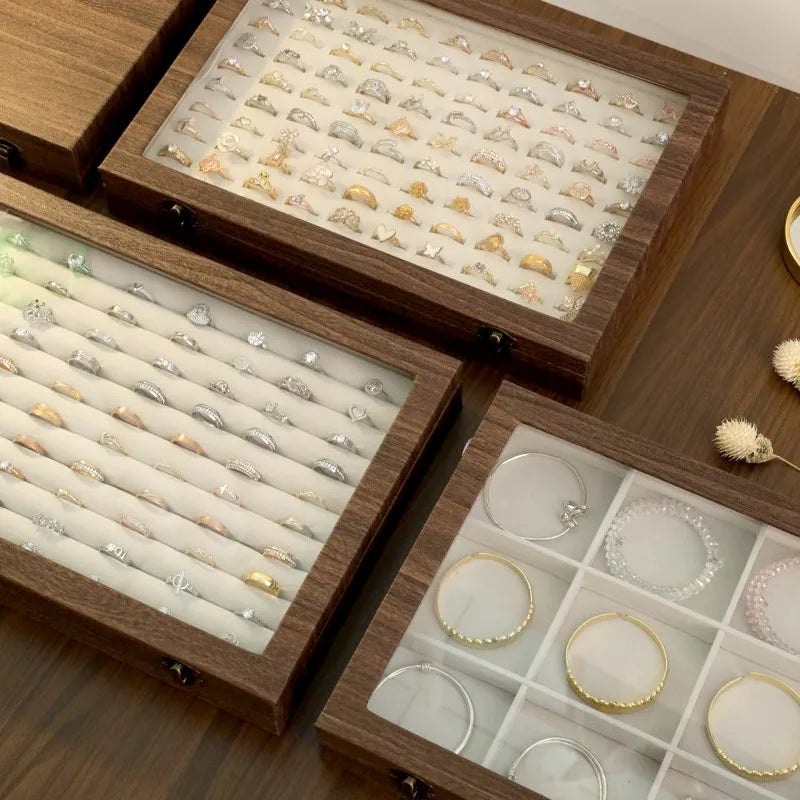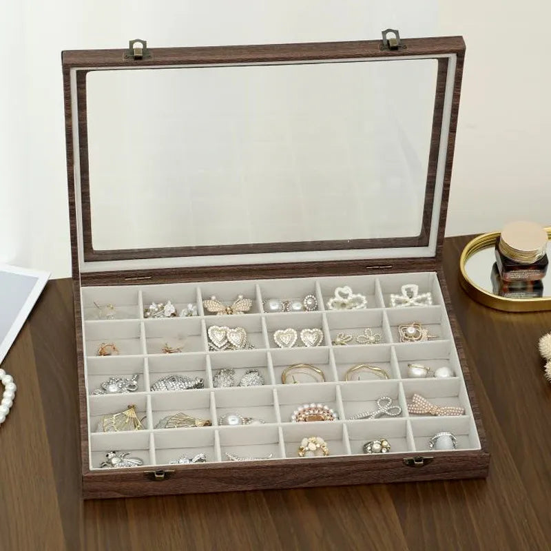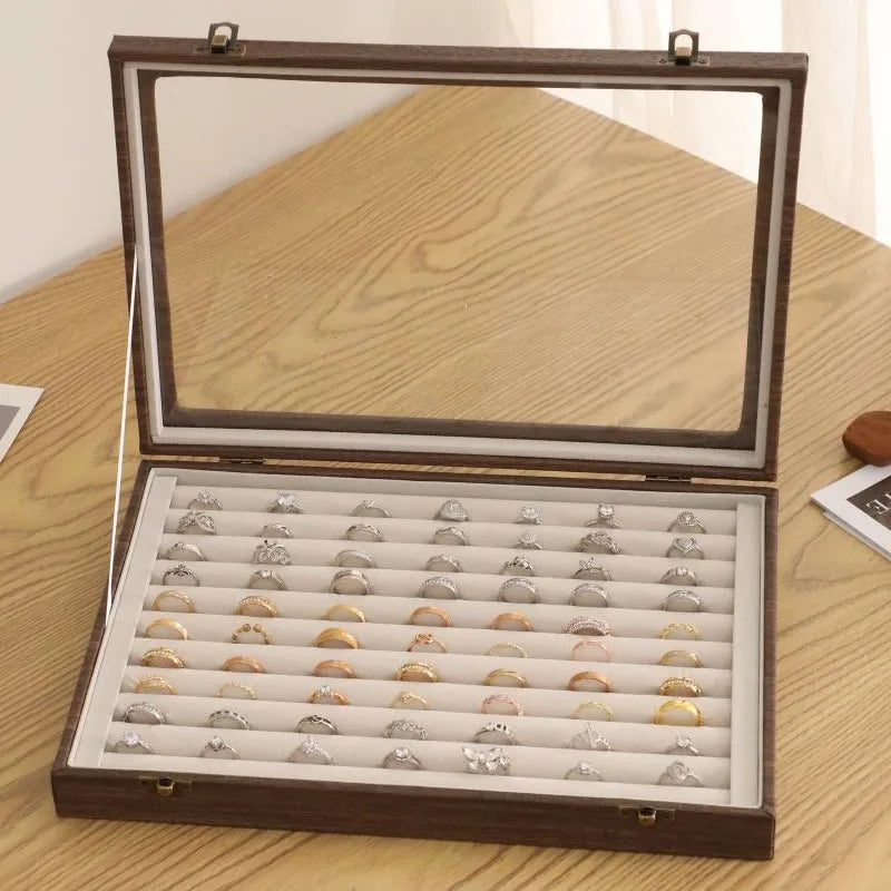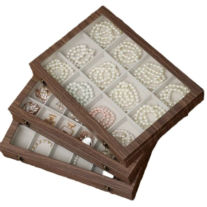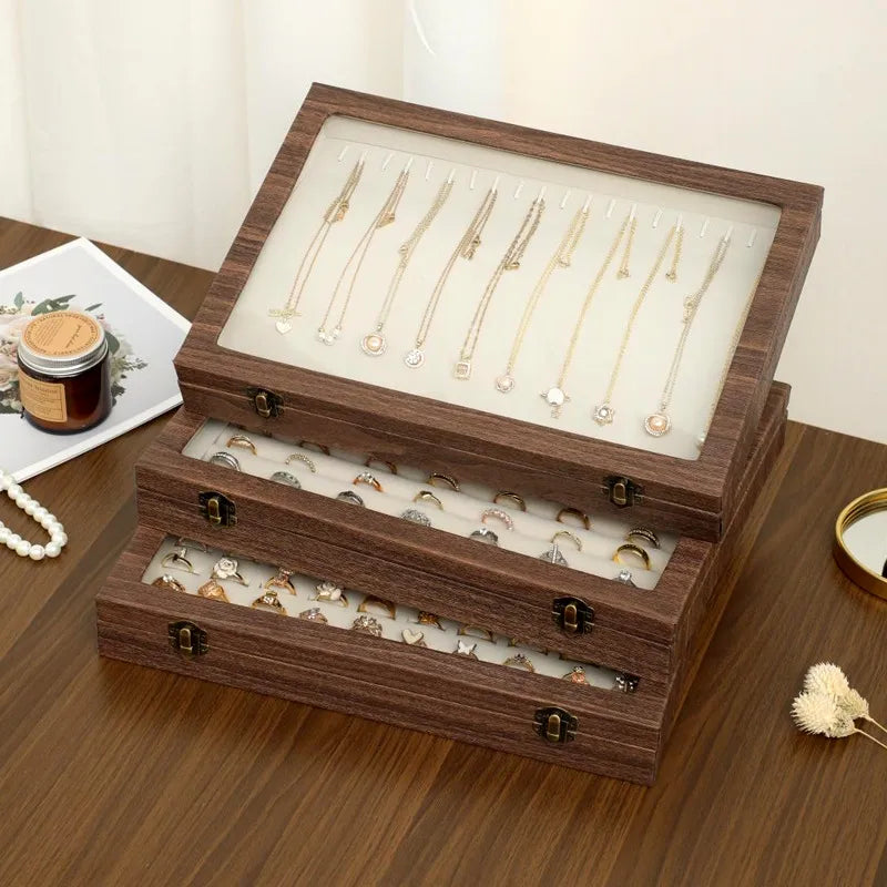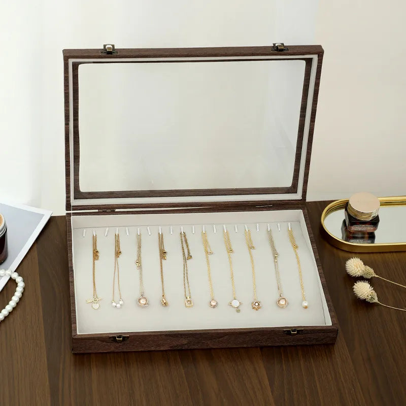 Retro Style Wooden Texture Leather Jewelry Box With Glass Lid Dustproof Storage For Rings Necklaces Bracelets Accessories Display