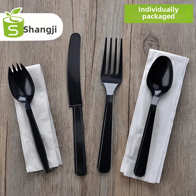 Shanghai Shangji black and white long handle plastic fork spoon disposable knife and fork creative portable tableware three-piece spoon