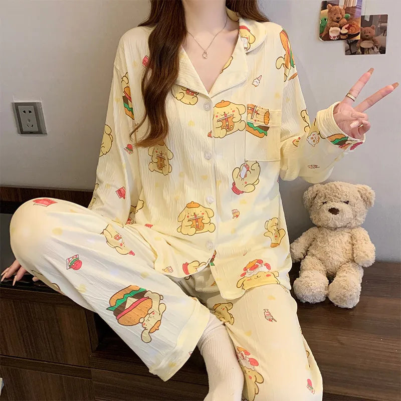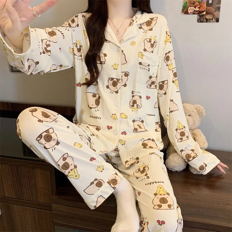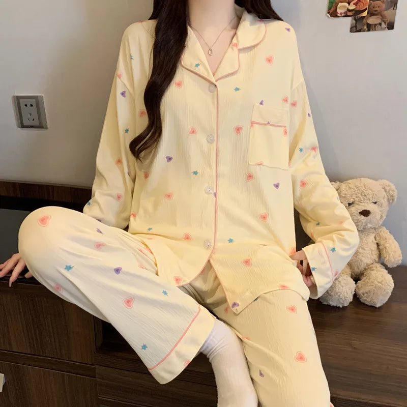 Sweet Girl Heart Print Open Cardigan Sleepwear Long Sleeve Crepe Home Clothes Set Spring New Style Casual Breathable Polyester