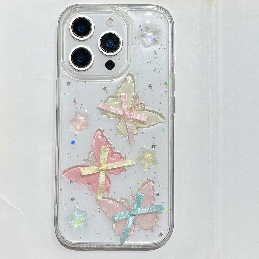 Trendy Butterfly Knot Silk Ribbon Phone Case For iPhone 16 Apple 15/14 Pro Max Women's 13 Silicone Transparent Color Drip Glue