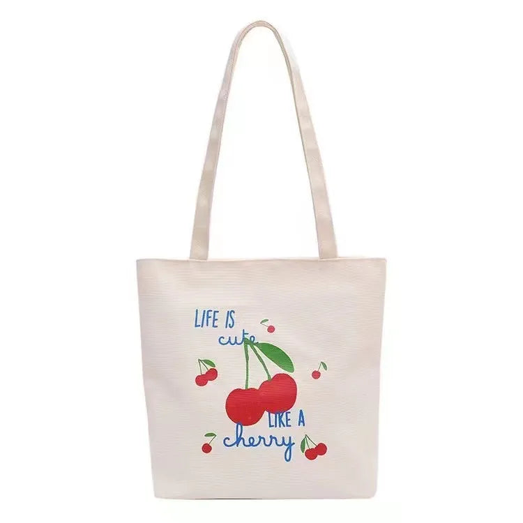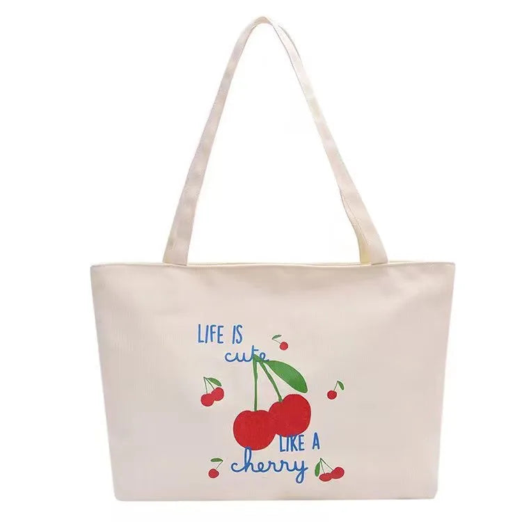 Women's Canvas Cherry Cute Sewing Thread Square Zipper Canvas Bag Tote Bag