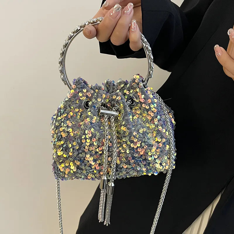 women's small spring&summer pu leather solid color fashion sequins bucket string bucket bag