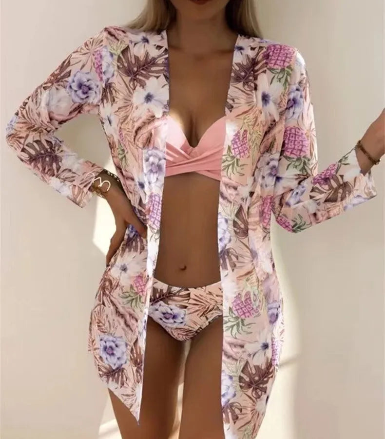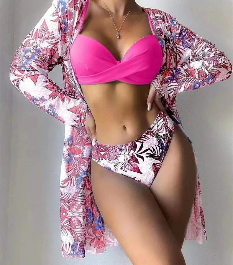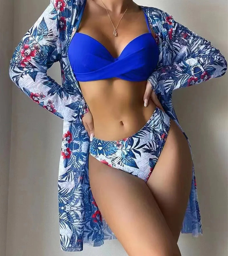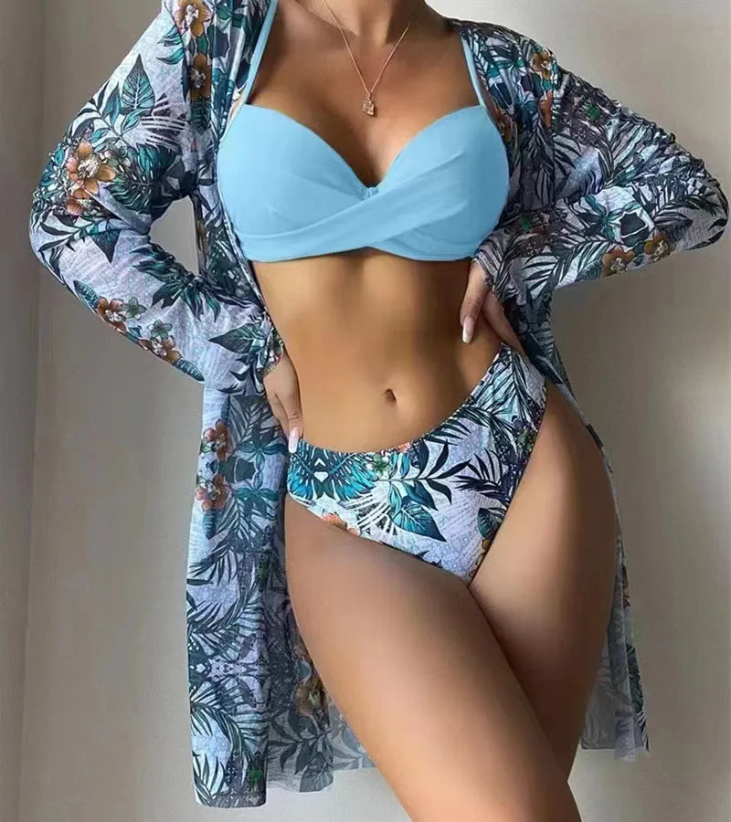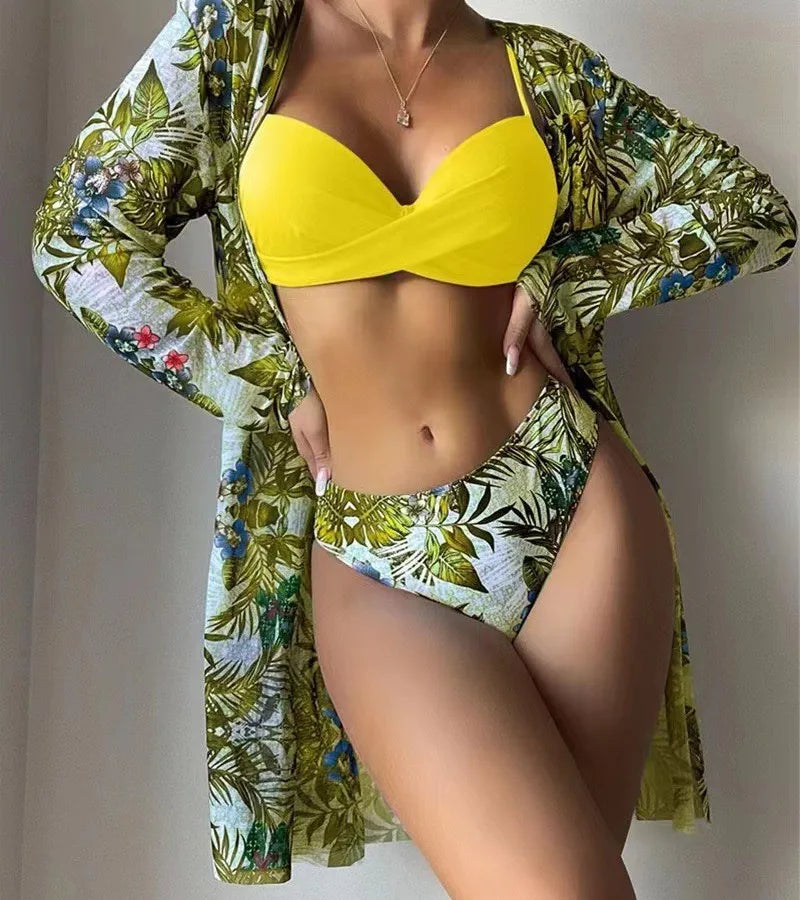 Women's Vacation Printing Solid Color 3 Pieces Set Bikinis Swimwear